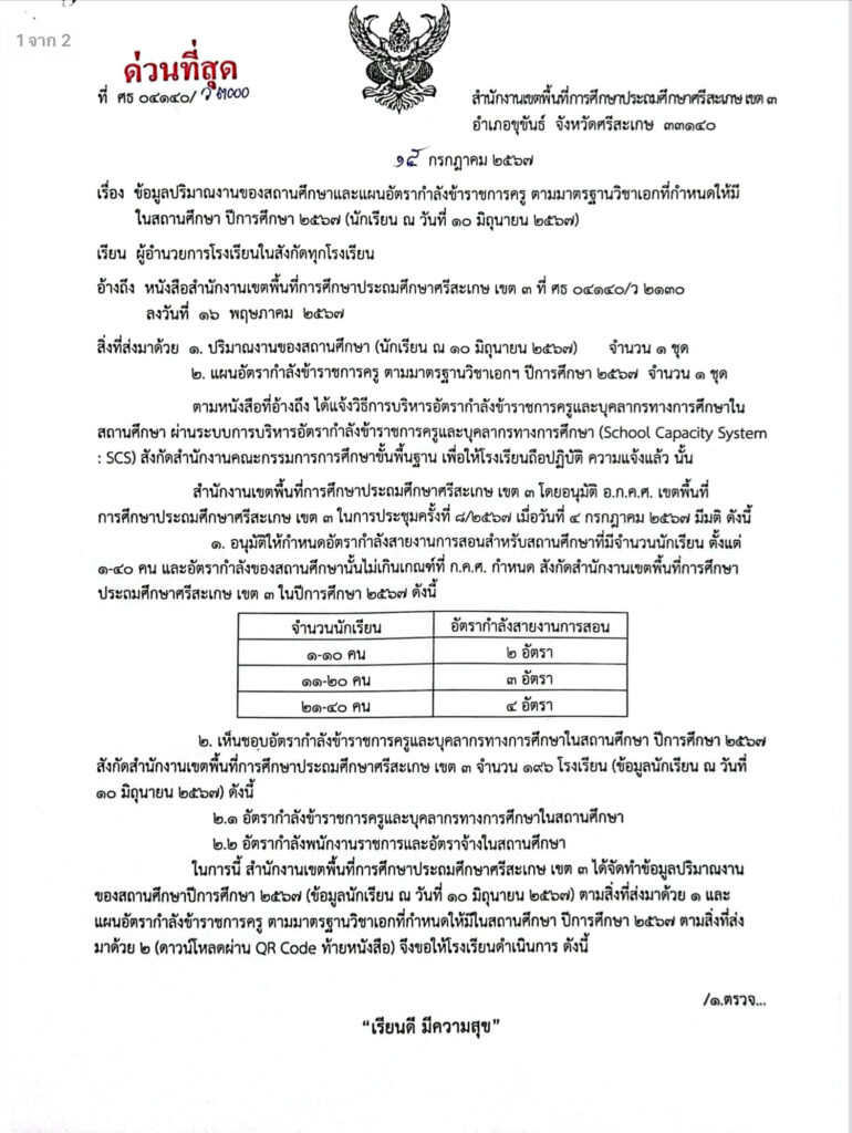ข้อมูลปริมาณงานของสถานศึกษาและแผนอัตรากำลังข้าราชการครู ตามมาตรฐานวิชาเอกที่กำหนดให้มีในสถานศึกษา ปีการศึกษา 2567 (นักเรียน ณ วันที่ 10 มิถุนายน 2567)